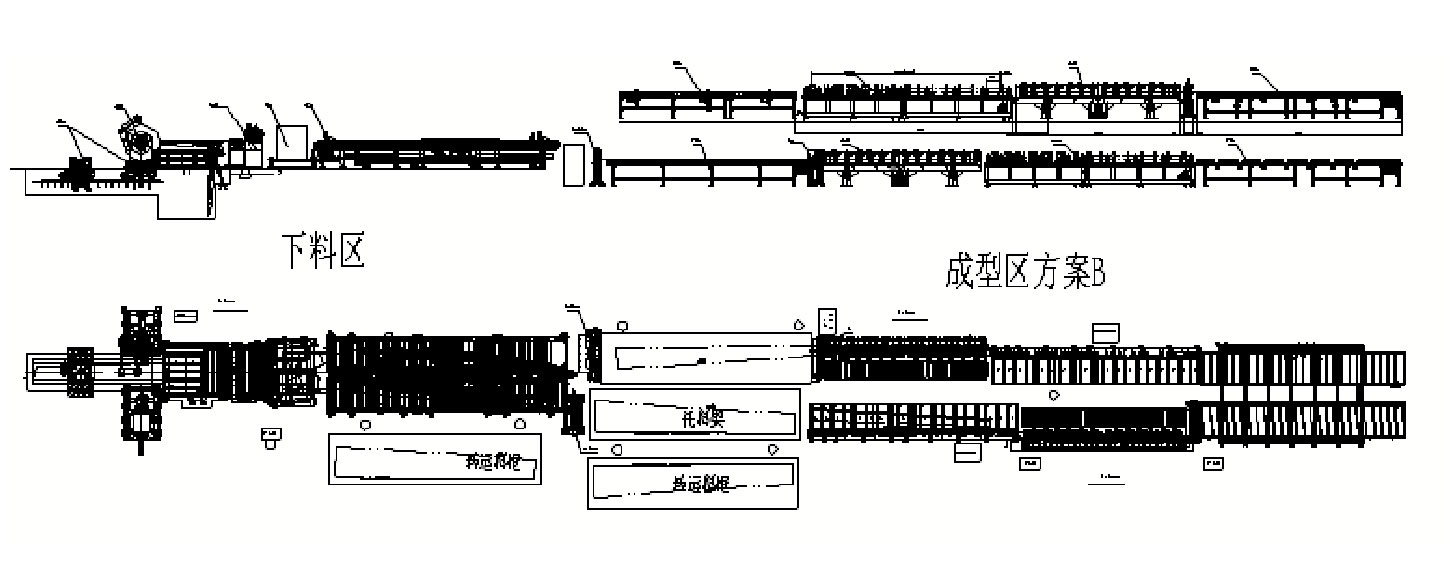 2 該生產(chǎn)線能生產(chǎn)多種板寬、截面、長(zhǎng)度的頂板,更換規(guī)格時(shí)需調(diào)整縱橫剪角度、沖缺口模具和切端頭擋料僅需調(diào)整相對(duì)位置,真空吸盤和翻邊壓料塊需根據(jù)板型不同做相應(yīng)更換,集中沖孔則需要根據(jù)板型的不同,調(diào)整個(gè)別沖孔機(jī),無需全部調(diào)整。通過以上操作,便可實(shí)現(xiàn)多種板型的生產(chǎn)。