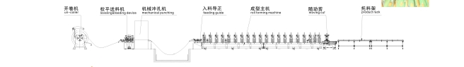 上料平臺(tái)—開(kāi)卷機(jī)—伺服送料—沖孔沖壓—輥壓成型—切斷—翻轉(zhuǎn)送料